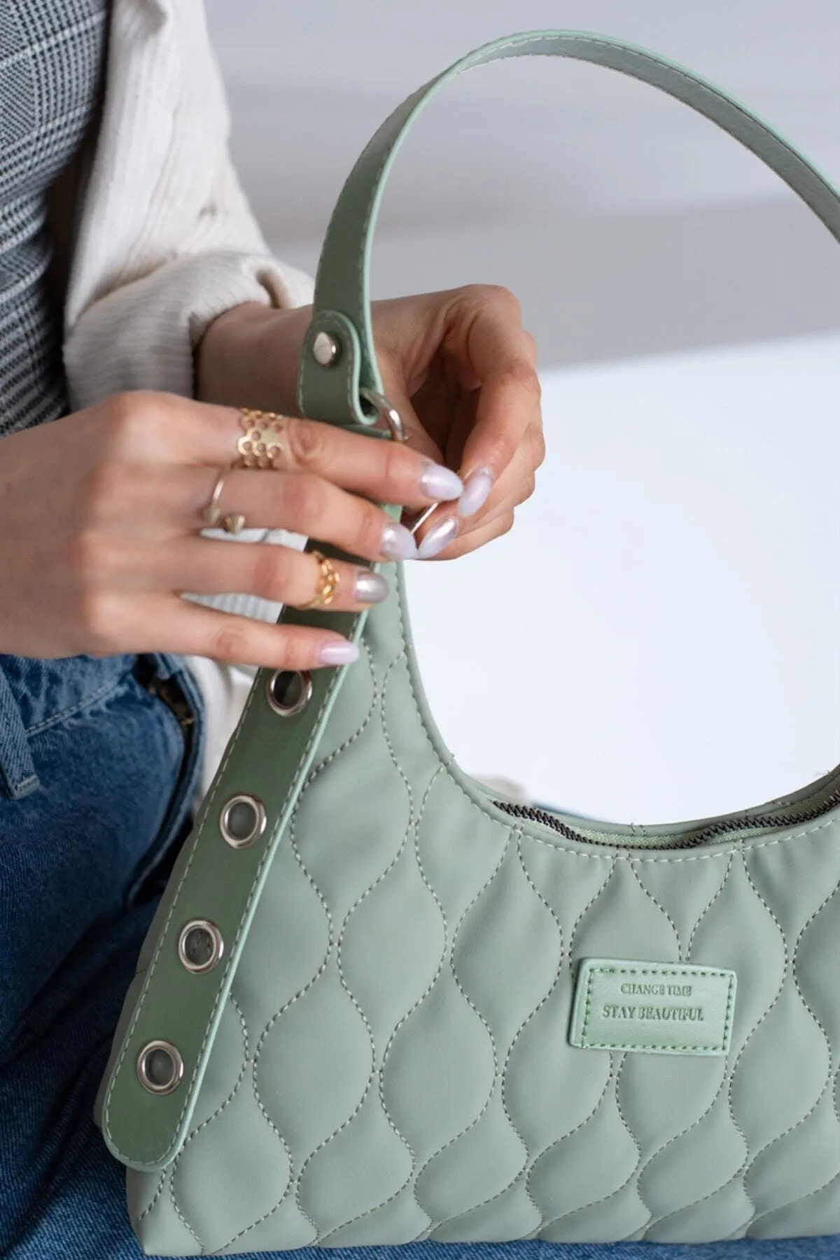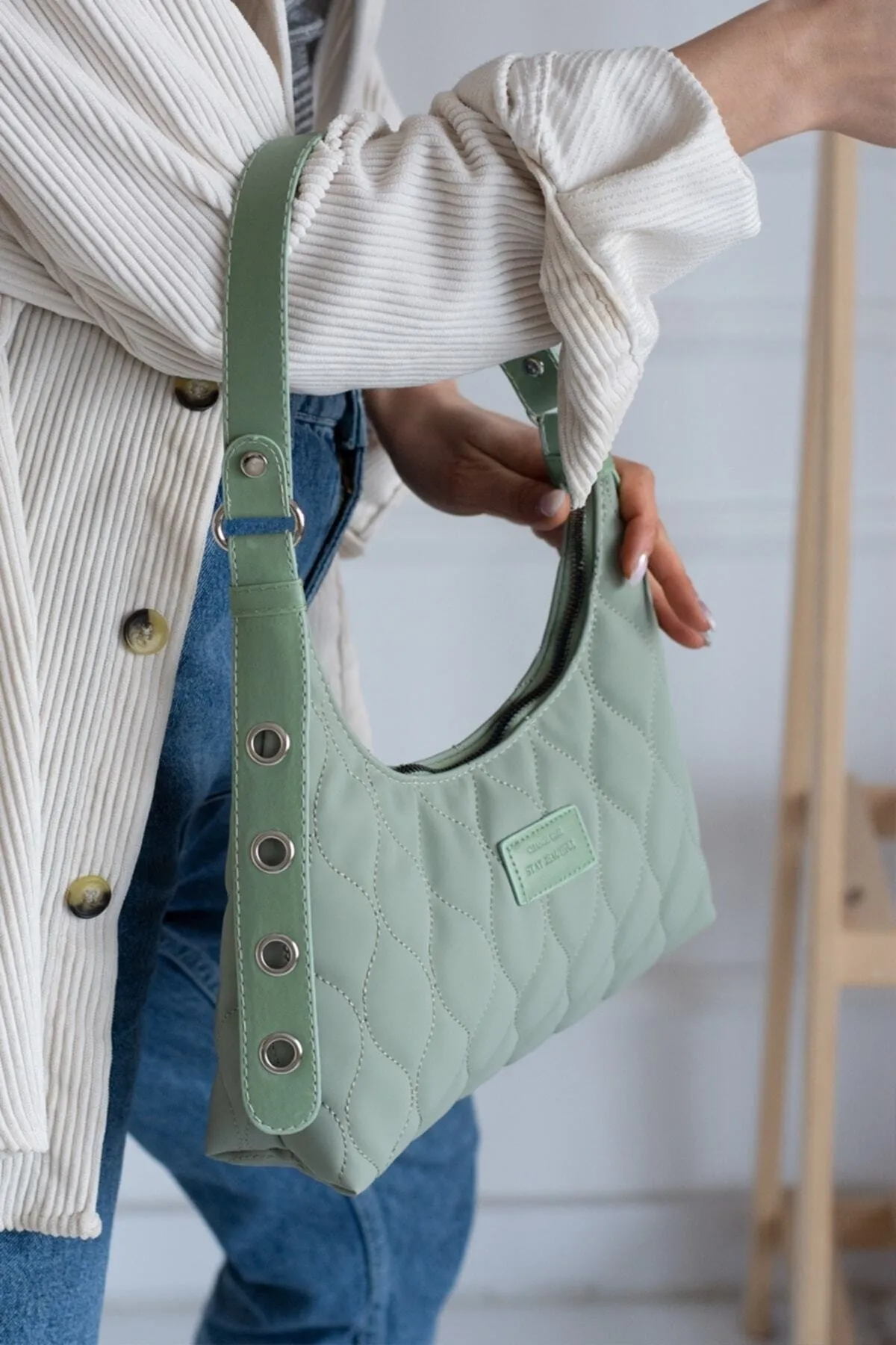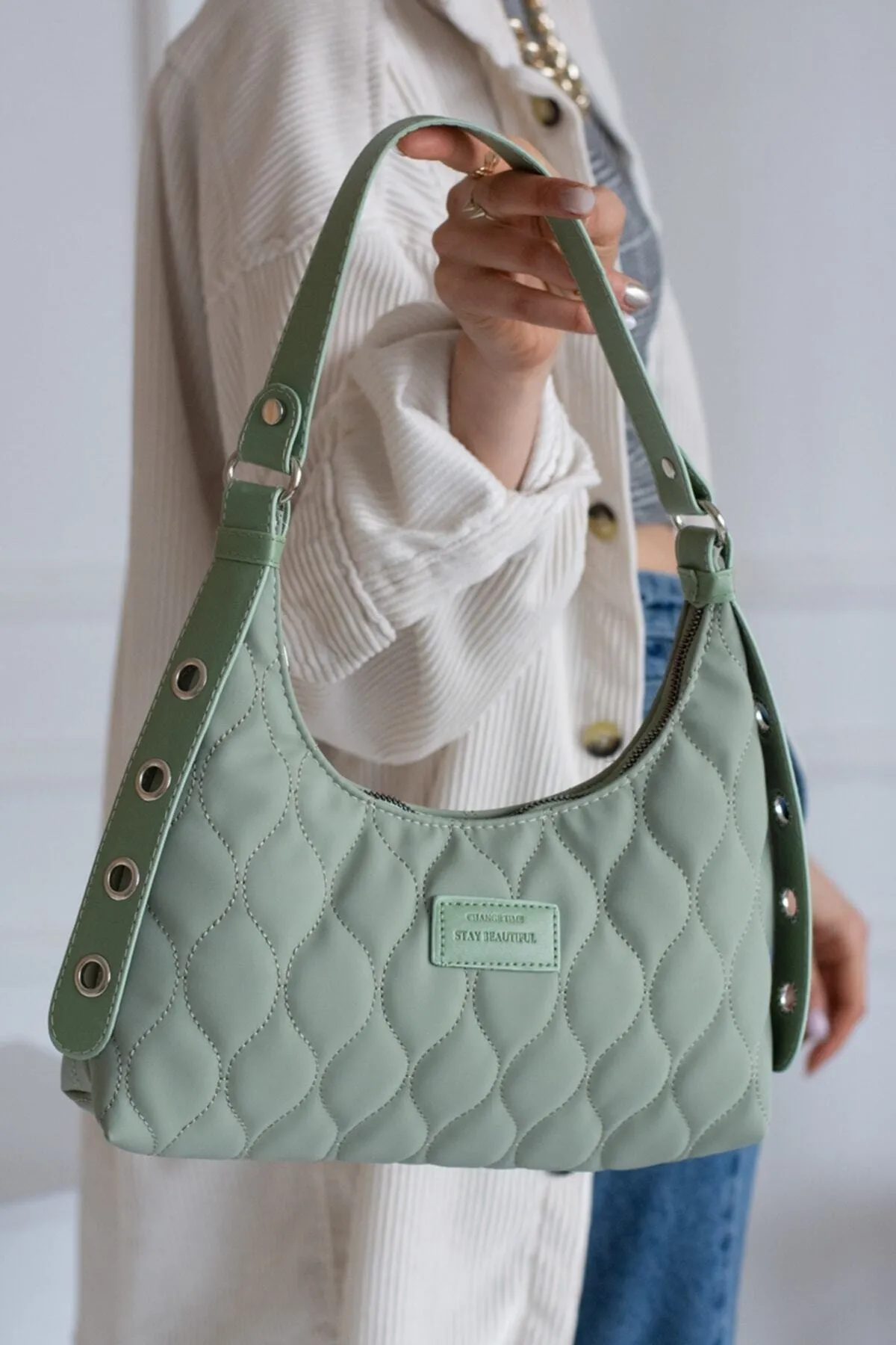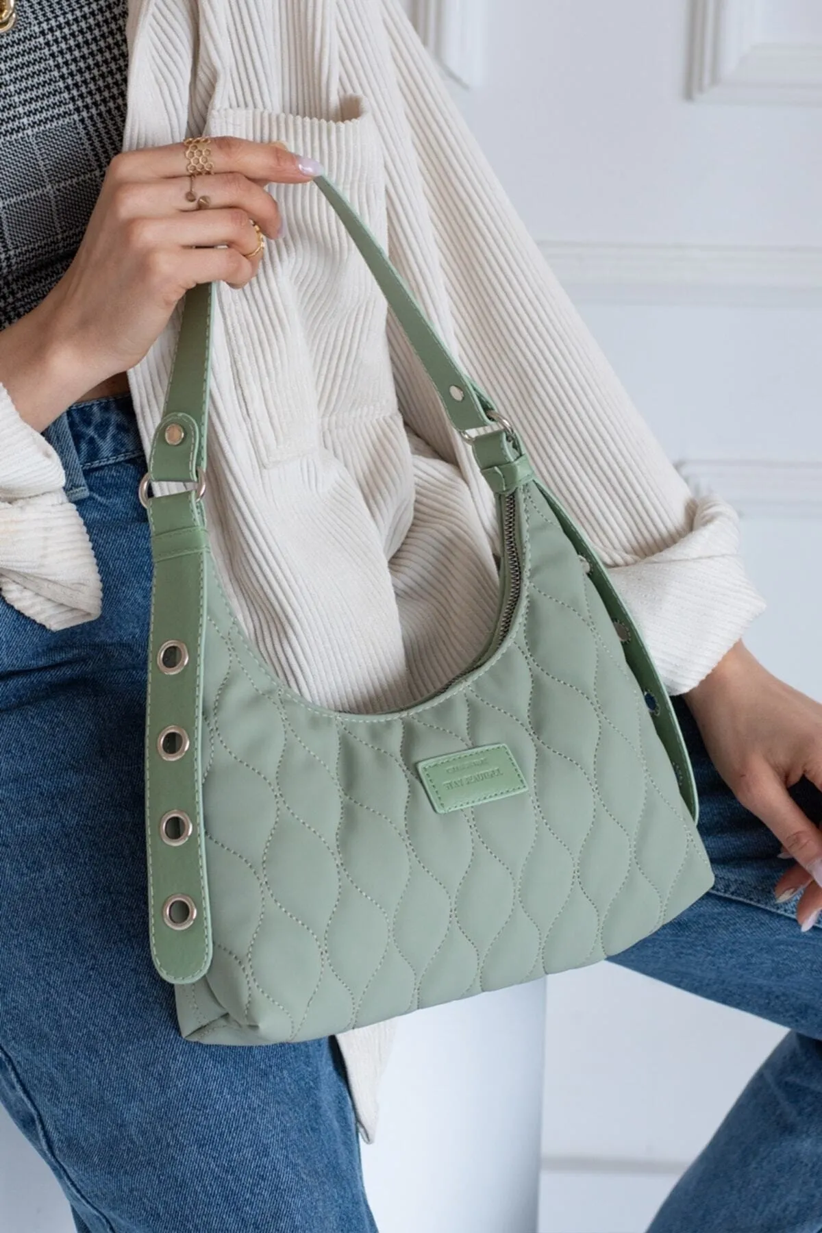 Kadın Mint Yeşili Kapitone Desenli Baget El Ve Omuz Çantası